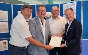 Georg Koenen strahlt. „Es ist toll, dass es mit dem Förderbescheid geklappt hat. Jetzt kann es richtig losgehen“, sagt der Weezer Bürgermeister. Am Wochenende war Staatssekretär Daniel Sieveke vom NRW-Bauministerium in der Gemeinde und hatte die gute Nachricht für das ambitionierte Projekt im Gepäck. Schon seit einiger Zeit gibt es die Idee, das Haus Rüttermann zu erwerben und zu einem „Haus der Geschichte(n)“ (HdG) zu machen. Es soll ein Haus werden, in dem die Weezer Geschichte greifbar und erlebbar wird. Jetzt ist dieses Projekt einen wichtigen Schritt voran gekommen. Sieveke überreichte den Zuwendungsbescheid in Höhe von 250.000 Euro an Bürgermeister Georg Koenen. (Foto: Gemeinde Weeze)